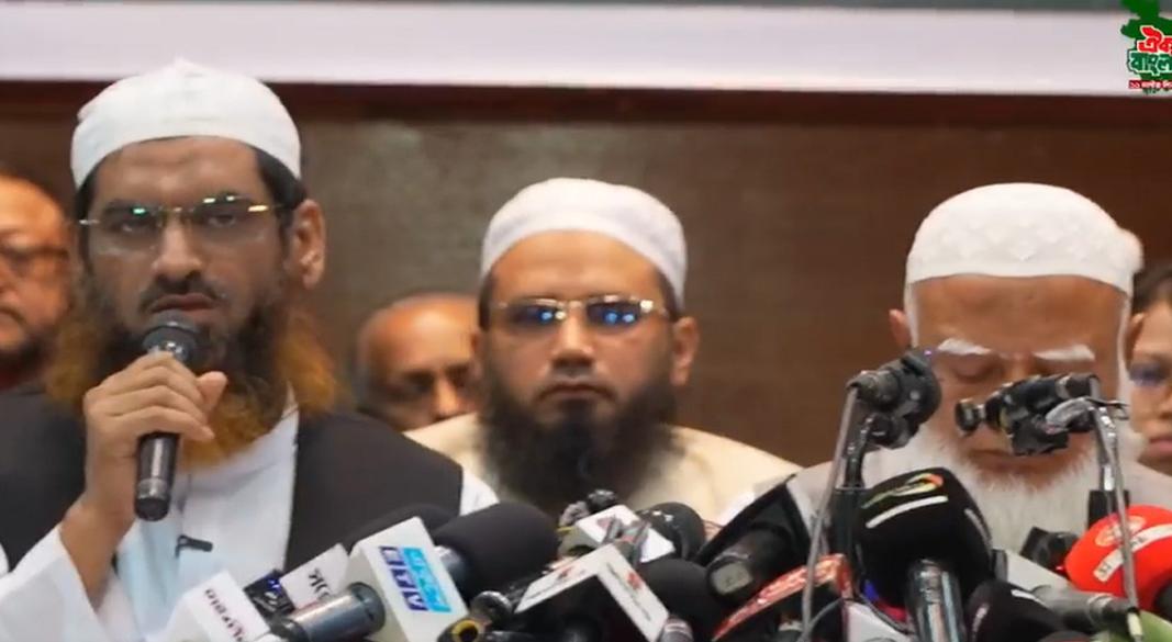 সংবাদ সম্মেলনে জামায়াত আমির ডা. শফিকুর রহমানসহ ১১ দলের শীর্ষ নেতারা অংশ নিয়েছেন