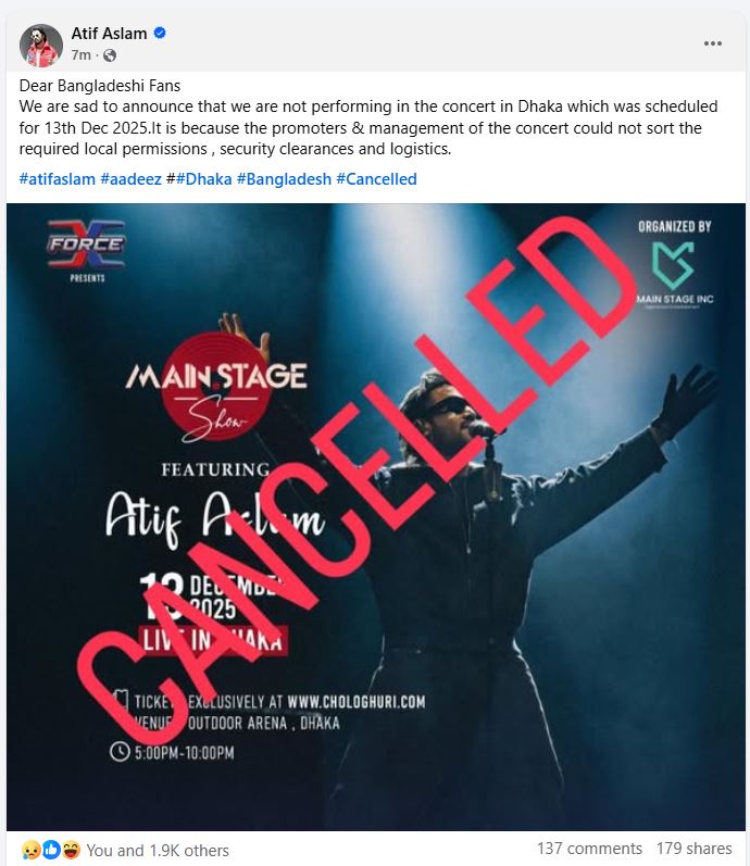 সামাজিক মাধ্যমে বাংলাদেশি ভক্তদের উদ্দেশে দুঃখ প্রকাশ করেছেন আতিফ আসলাম। এক পোস্টে তিনি লিখেছেন, “প্রিয় বাংলাদেশি ভক্তরা, দু:খের সঙ্গে জানাচ্ছি যে ১৩ ডিসেম্বর ঢাকায় আমাদের কনসার্টটি আর অনুষ্ঠিত হচ্ছে না। কারণ, আয়োজক ও ম্যানেজমেন্ট দল প্রয়োজনীয় স্থানীয় অনুমতি, নিরাপত্তাজনিত ছাড়পত্র এবং লজিস্টিকসহ অন্যান্য আনুষ্ঠানিকতা সম্পন্ন করতে পারেনি।”