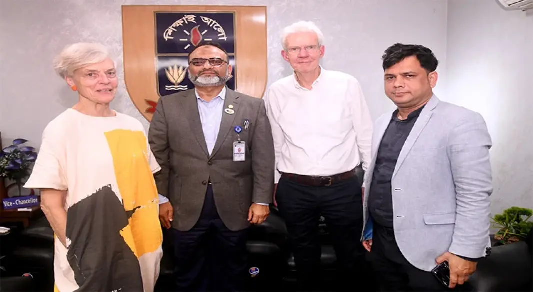 ঢাকা বিশ্ববিদ্যালয়ের (ঢাবি) উপাচার্য অধ্যাপক ড. নিয়াজ আহমদ খানের সঙ্গে সৌজন্য সাক্ষাৎ করেছেন কিংস কলেজ লন্ডনের অধ্যাপক ডেভিড লিয়ন এবং লন্ডনের ওয়েস্টমিনস্টার বিশ্ববিদ্যালয়ের অধ্যাপক জিন সিটন।