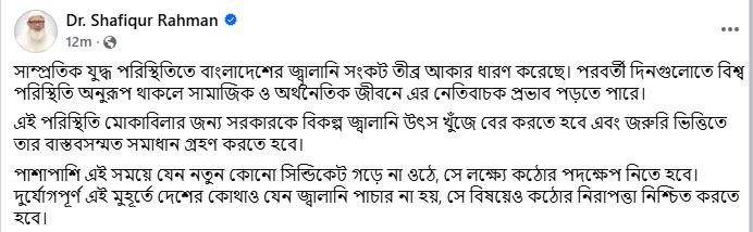 ফেসবুক পোস্টে জামায়াত আমির বলেন, ‘সাম্প্রতিক যুদ্ধ পরিস্থিতিতে বাংলাদেশের জ্বালানি সংকট তীব্র আকার ধারণ করেছে। পরে দিনগুলোতে বিশ্ব পরিস্থিতি অনুরূপ থাকলে সামাজিক ও অর্থনৈতিক জীবনে এর নেতিবাচক প্রভাব পড়তে পারে।’