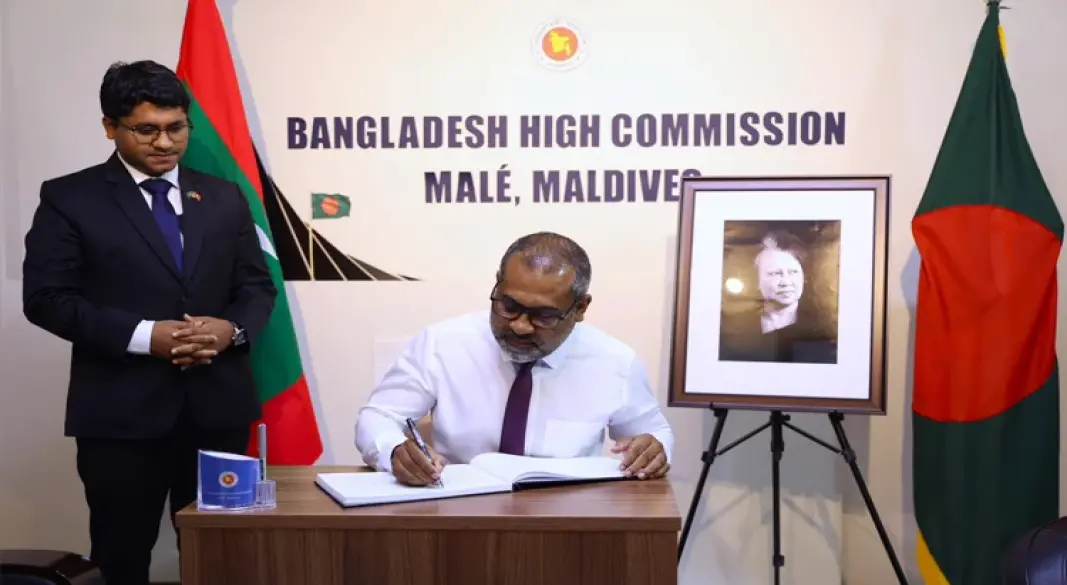 আজ সোমবার মালদ্বীপের মালেতে অবস্থিত বাংলাদেশ হাইকমিশনে গিয়ে তিনি এই শোক বইয়ে স্বাক্ষর করেন।