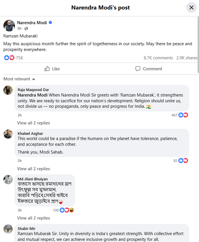 স্ট্যাটাসে নরেন্দ্র মোদি বলেন, ‘রমজান মোবারক! এই পবিত্র মাস আমাদের সমাজে ঐক্যকে আরও প্রসারিত করুক। সর্বত্র শান্তি ও সমৃদ্ধি আসুক।'
