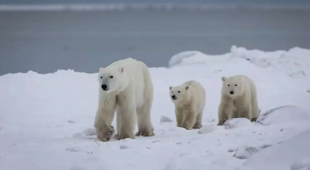 গবেষকদের ধারণ করা ভিডিও ফুটেজে দেখা যায়, বরফে ঢাকা বিস্তীর্ণ প্রাকৃতিক পরিবেশ পর্যবেক্ষণ করছে দুই শাবক, আর তাদের পেছনে পায়চারি করছে মা ভালুক।