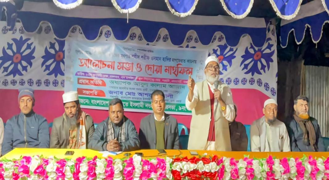 রাজশাহী-৩ (পবা-মোহনপুর) আসনে জামায়াতে ইসলামীর সংসদ সদস্য প্রার্থী অধ্যাপক আবুল কালাম আজাদ বলেছেন, শহীদ শরীফ উসমান হাদির আত্মত্যাগ নতুন প্রজন্মের জন্য এক অনন্য প্রেরণার উৎস। তাঁর জীবন ও আদর্শ ন্যায়, ইনসাফ এবং সত্যের পথে অবিচল থাকার শিক্ষা দেয়। শহীদদের ইতিহাস ধারণ করেই একটি নৈতিক ও মানবিক সমাজ গড়ে তোলা সম্ভব। মঙ্গলবার (২০ জানুয়ারি) সন্ধ্যায় নওহাটা পৌরসভার শিয়ালবেড় মোড়ে শহীদ শরীফ উসমান হাদির আত্মার মাগফেরাত কামনায় আয়োজিত আলোচনা সভা ও দোয়া মাহফিলে প্রধান অতিথির বক্তব্যে তিনি এসব কথা বলেন। অনুষ্ঠানের আয়োজন করে জামায়াতে ইসলামী নওহাটা পৌরসভা ৯ নম্বর ওয়ার্ড কার্যালয়।