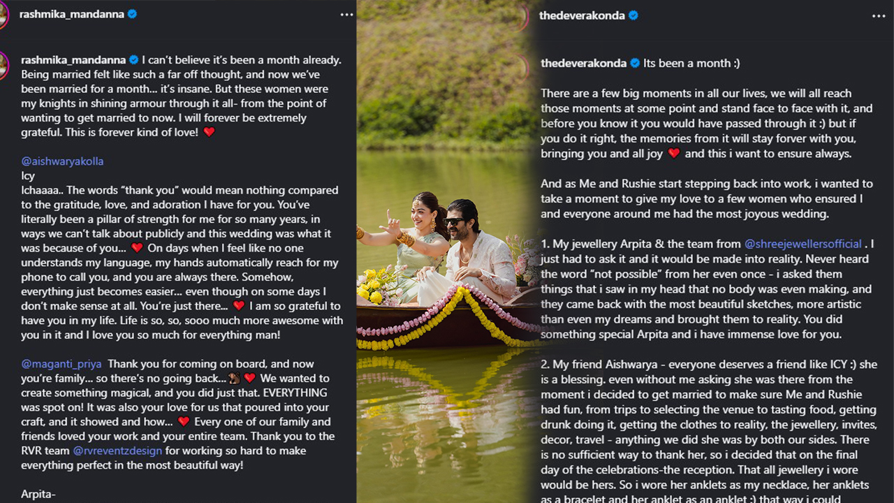 নিজের সোশ্যাল হ্যান্ডেলে একটি পোস্ট শেয়ার করে রাশমিকা মান্দানা লিখেছেন, ‘আমি বিশ্বাস করতে পারছি না যে এরই মধ্যে এক মাস হয়ে গেল। বিয়ে করাটা একটা স্বপ্ন ছিল, আর এখন এক মাস হয়ে গেল। কিন্তু এই নারীদের সাহায্যেই সব কিছু সম্ভব হয়েছে। আমি চিরকাল কৃতজ্ঞ থাকবো।’