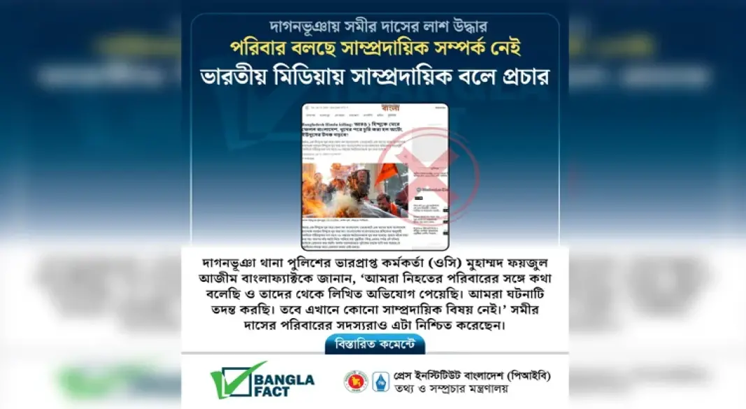 দাগনভূঞায় সমীর দাস নিহতের ঘটনার সঙ্গে সাম্প্রদায়িক কোনো সম্পর্ক নেই। অথচ ভারতীয় মিডিয়ায় একে সাম্প্রদায়িক হিসেবে অপপ্রচার করা হচ্ছে বলে শনাক্ত করেছে প্রেস ইনস্টিটিউট বাংলাদেশের (পিআইবি) ফ্যাক্ট চেক ও মিডিয়া রিসার্চ টিম বাংলাফ্যাক্ট।