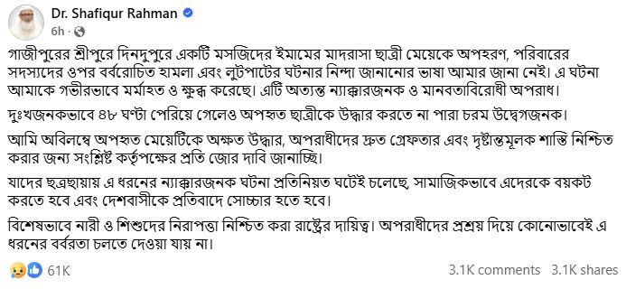 তিনি লেখেন, এ ঘটনা তাকে গভীরভাবে মর্মাহত ও ক্ষুব্ধ করেছে। এটি অত্যন্ত ন্যক্কারজনক ও মানবতাবিরোধী অপরাধ। ৪৮ ঘণ্টা পেরিয়ে গেলেও অপহৃত ছাত্রীকে উদ্ধার না করতে পারা চরম উদ্বেগজনক বলেও তিনি মন্তব্য করেন।