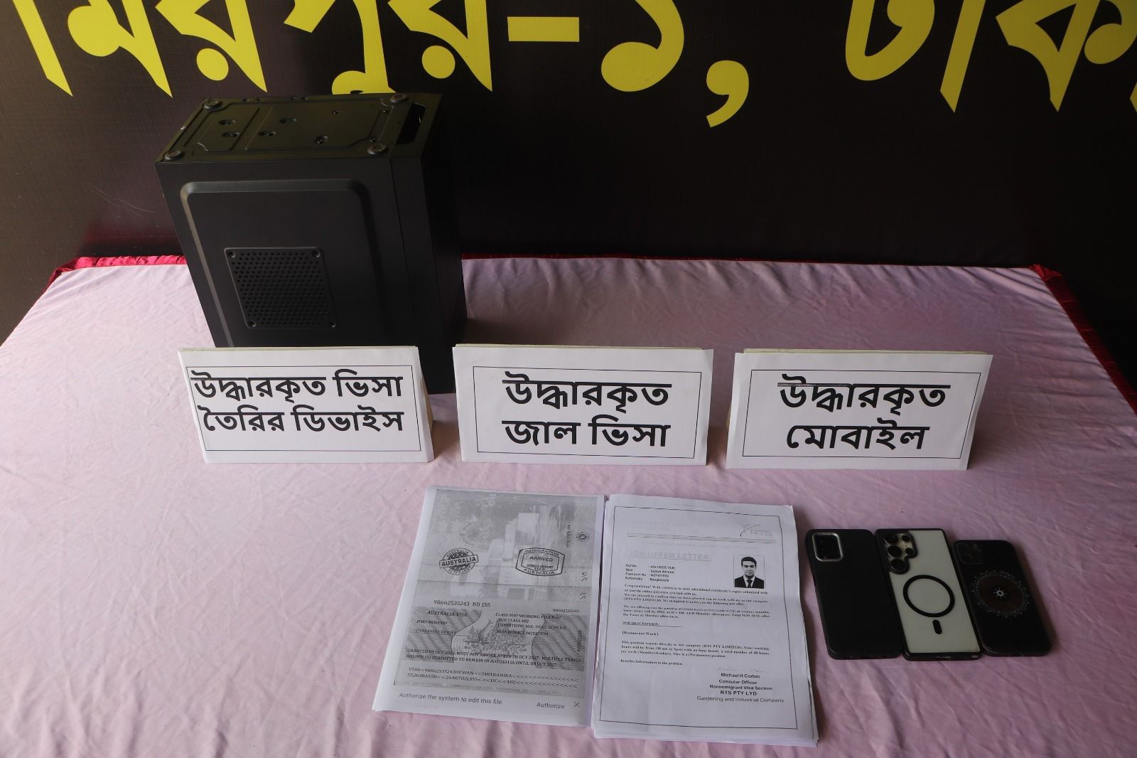 অভিযান চলাকালে তাদের কাছ থেকে ভিসা তৈরির ডিভাইস এবং বিপুল পরিমাণ জাল ভিসা জব্দ করা হয়।
