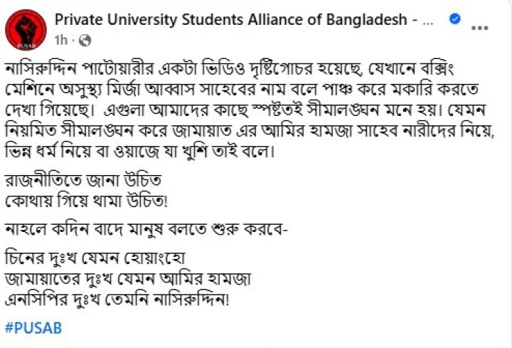“নাসীরুদ্দীন পাটোয়ারীর একটা ভিডিও দৃষ্টিগোচর হয়েছে, যেখানে বক্সিং মেশিনে অসুস্থ্য মির্জা আব্বাস সাহেবের নাম বলে পাঞ্চ করে মকারি করতে দেখা গিয়েছে। এগুলা আমাদের কাছে স্পষ্টতই সীমালঙ্ঘন মনে হয়। যেমন নিয়মিত সীমালঙ্ঘন করে জামায়াতের আমির হামজা সাহেব নারীদের নিয়ে, ভিন্ন ধর্ম নিয়ে বা ওয়াজে যা খুশি তাই বলে। রাজনীতিতে জানা উচিত কোথায় গিয়ে থামা উচিত! নাহলে কদিন বাদে মানুষ বলতে শুরু করবে — চিনের দুঃখ যেমন হোয়াংহো, জামায়াতের দুঃখ যেমন আমির হামজা, এনসিপির দুঃখ তেমনি নাসীরুদ্দীন!”