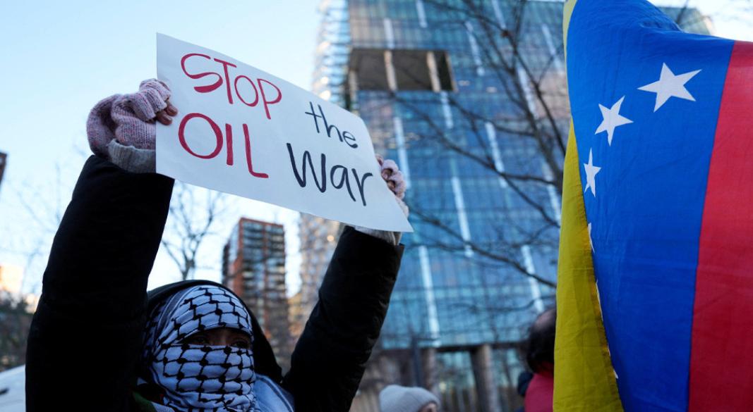 ৩ জানুয়ারি মার্কিন প্রেসিডেন্ট ডোনাল্ড ট্রাম্প ভেনেজুয়েলায় হামলা ও প্রেসিডেন্ট নিকোলাস মাদুরোকে সস্ত্রীক আটকের দাবির পর লন্ডনে যুক্তরাষ্ট্রের দূতাবাসের বাইরে প্রতিবাদকারীরা। ছবি : রয়টার্স