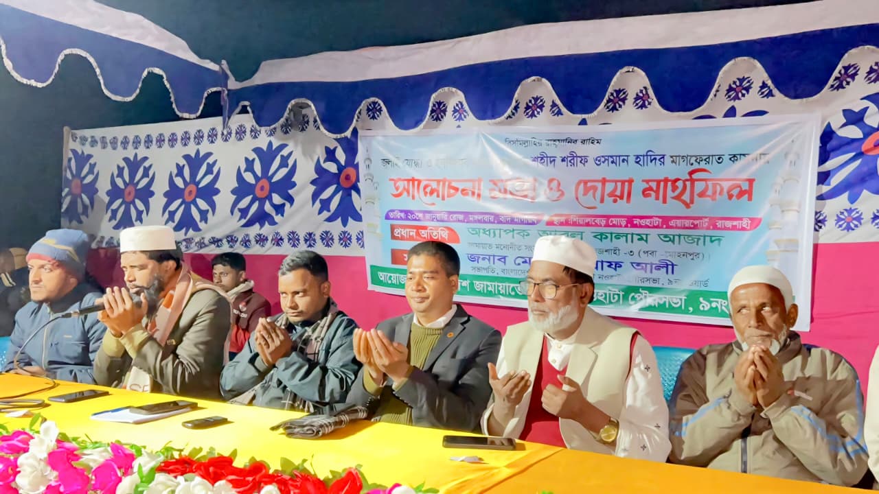 রাজশাহী-৩ (পবা-মোহনপুর) আসনে জামায়াতে ইসলামীর সংসদ সদস্য প্রার্থী অধ্যাপক আবুল কালাম আজাদ বলেছেন, শহীদ শরীফ উসমান হাদির আত্মত্যাগ নতুন প্রজন্মের জন্য এক অনন্য প্রেরণার উৎস। তাঁর জীবন ও আদর্শ ন্যায়, ইনসাফ এবং সত্যের পথে অবিচল থাকার শিক্ষা দেয়। শহীদদের ইতিহাস ধারণ করেই একটি নৈতিক ও মানবিক সমাজ গড়ে তোলা সম্ভব। মঙ্গলবার (২০ জানুয়ারি) সন্ধ্যায় নওহাটা পৌরসভার শিয়ালবেড় মোড়ে শহীদ শরীফ উসমান হাদির আত্মার মাগফেরাত কামনায় আয়োজিত আলোচনা সভা ও দোয়া মাহফিলে প্রধান অতিথির বক্তব্যে তিনি এসব কথা বলেন। অনুষ্ঠানের আয়োজন করে জামায়াতে ইসলামী নওহাটা পৌরসভা ৯ নম্বর ওয়ার্ড কার্যালয়।