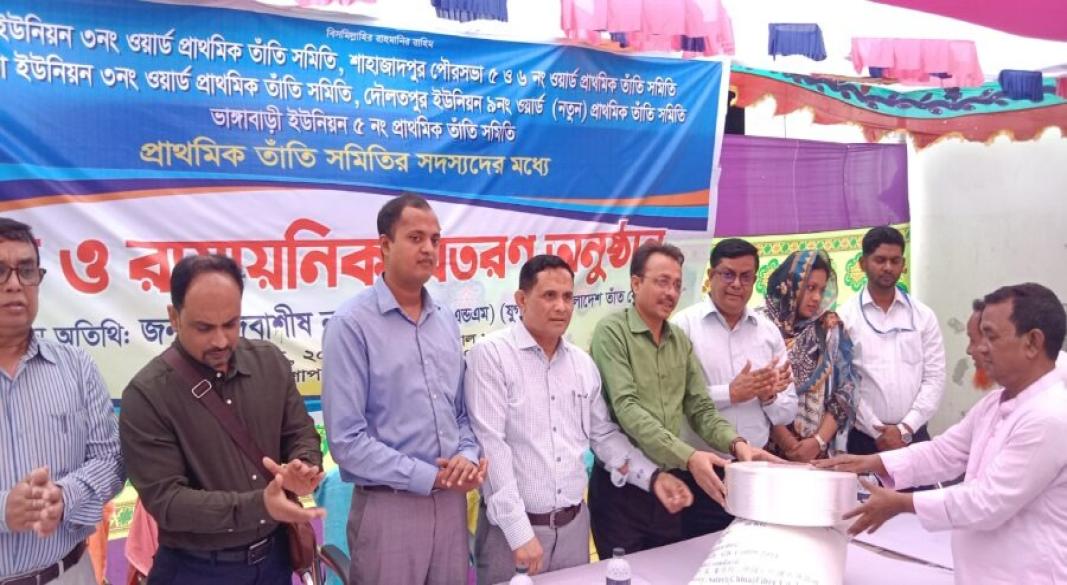 সিরাজগঞ্জ জেলায় আজ বাংলাদেশ তাঁত বোর্ডের উদ্যোগে তাঁতিদের মধ্যে বিনা শুল্কে রং ও রাসায়নিক বিতরণ করা হয়েছে।